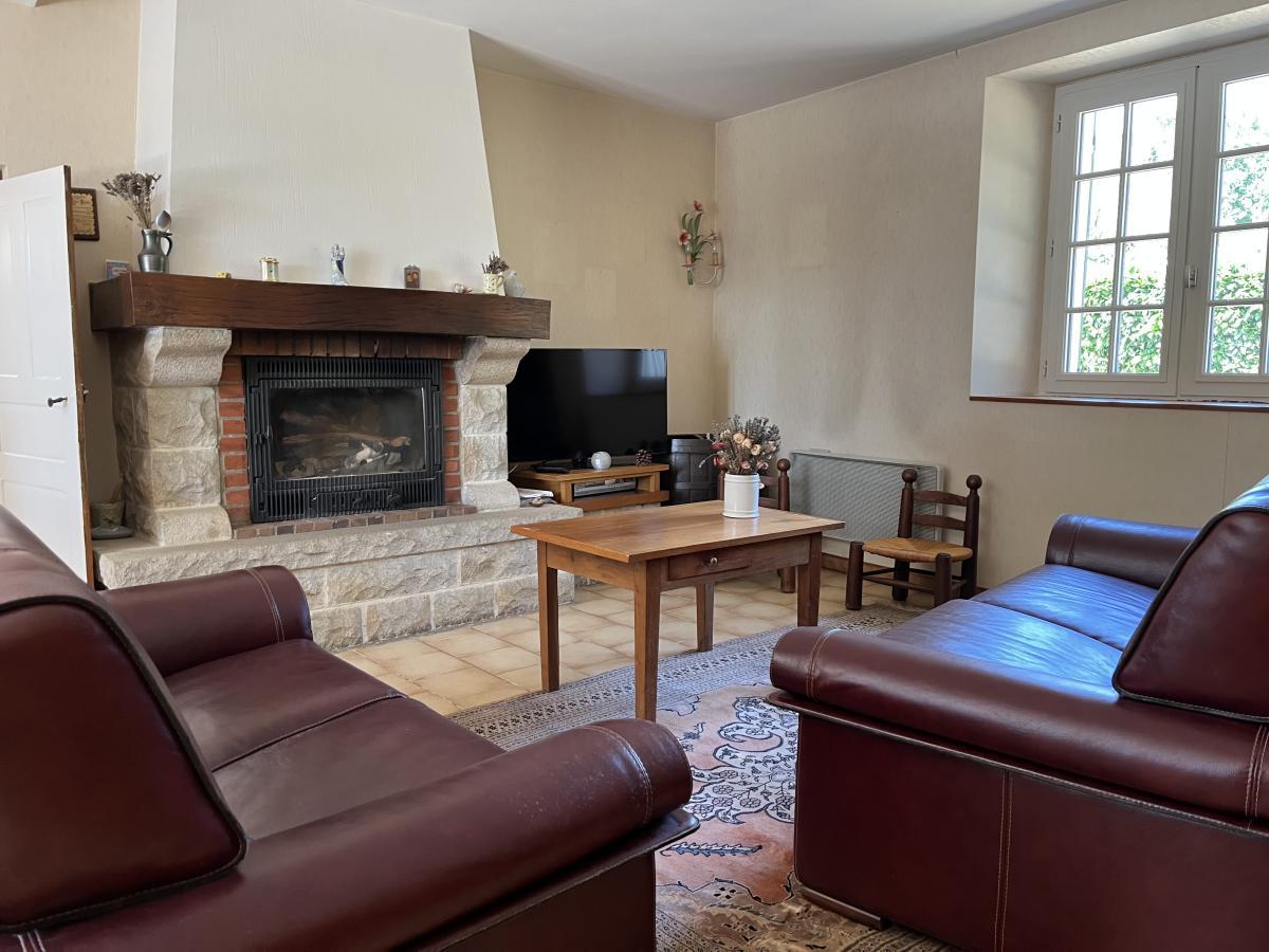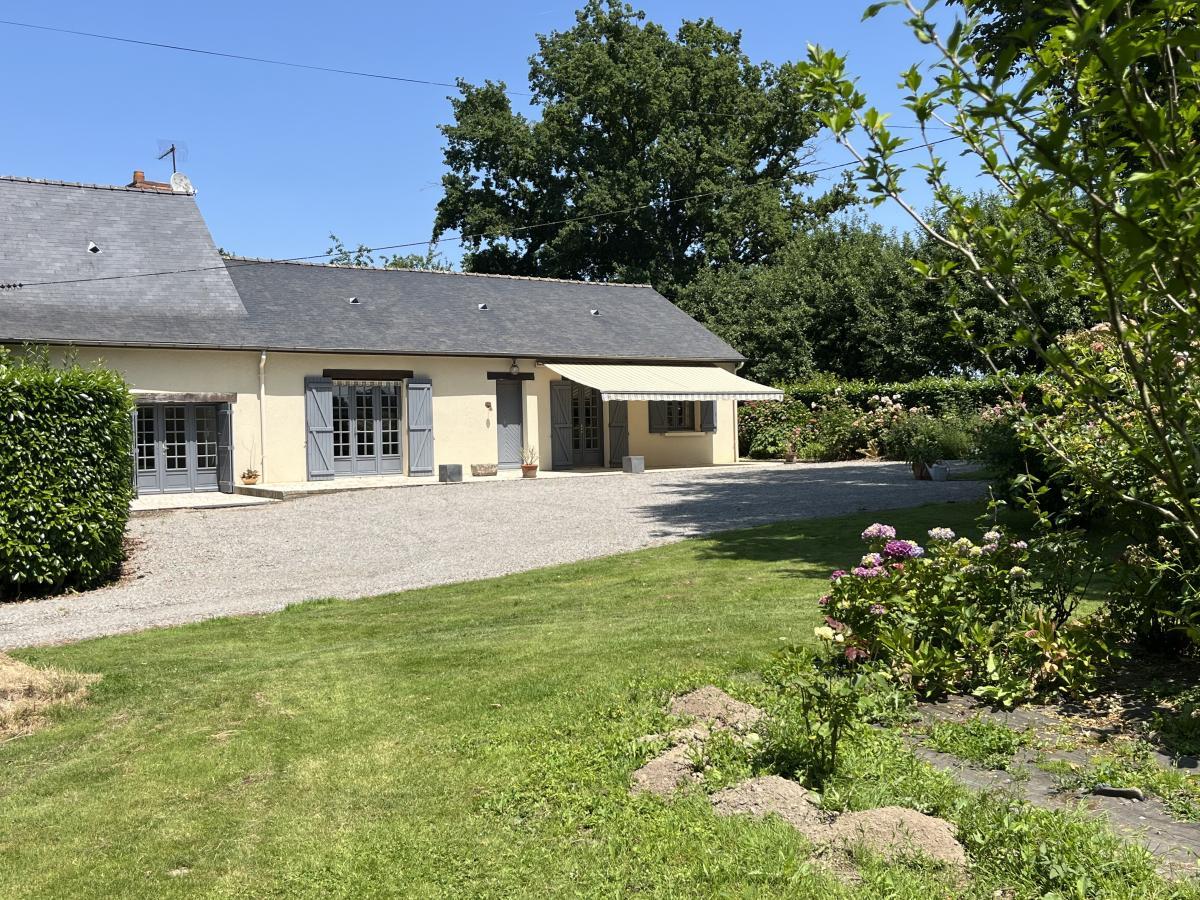Dans Hameau, Maison de plain pied comprenant entrée, séjour-salon avec cheminée (insert), cuisine aménagée et équipée, WC, salle de bains, dégagement desservant 2 chambres, cellier-cuisine, cave